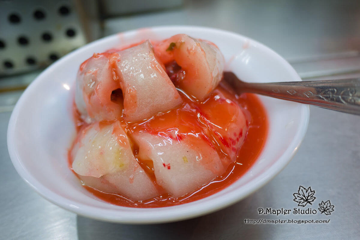 新竹肉圓一分兩粒,包含紅槽與筍干,外皮蠻有嚼勁。