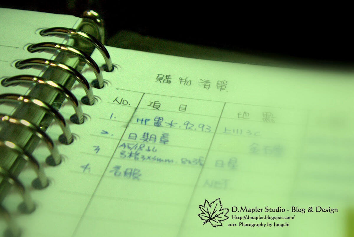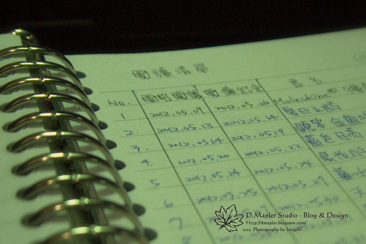 最近看了許多手帳的書籍,改變了我記帳的習慣與方式,MOLESKINE「傳奇筆記本」的活用術 一書中提及了許多的記帳方式,是我從未思考過的,還記的進實驗室後,我的筆記就是以日記的方式記錄著,雖然資訊的紀錄很多,但是錯綜複雜,只用幾張書籤就想打發許多的重點,但在此書中有提到可以加上頁碼,並以目錄的方式來回顧重點,這真是一項很大的幫助。當然在書中還提到許多比如,購物清單、閱讀清單、閱讀日記…等等。這些許許多多的技巧真的明顯改變了我。