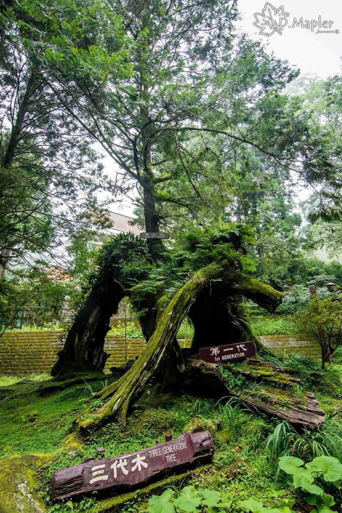 沒有人能確認第一代的檜木何時倒下,只能臆測它的樹齡約莫1500年左右。當第一代倒伏之後,由於樹幹的透空讓更多的光線照射進來,加上橫臥在地,以霧林帶的氣候,樹的表層可以長出苔蘚以保持溼潤,這些因素導致落在枯死檜木樹體上的種子較容易發芽,第二代便這樣產生了。長出的第二代跨騎在第一代身上,過了數百年後,也面臨被砍伐的命運,第三代的種子便又從二代木上長出來,如此枯而復榮的林木生長現象,就形成現在的模樣了。三代木旁有一棵被砍掉的樹頭稱做象鼻木,從步道上方的角度俯瞰,彷彿是靜臥的象鼻。其實這些奇形怪狀的樹頭遍佈整個森林遊樂區。現今我們以外觀來形容這些檜木的殘骸,其實以樹頭的位置來看,百年前,阿里山到處是巨大的檜木原始林,這些千年檜木節比鱗次的叢生在此,其景象是何等的壯觀!<取自阿里山官方網站>