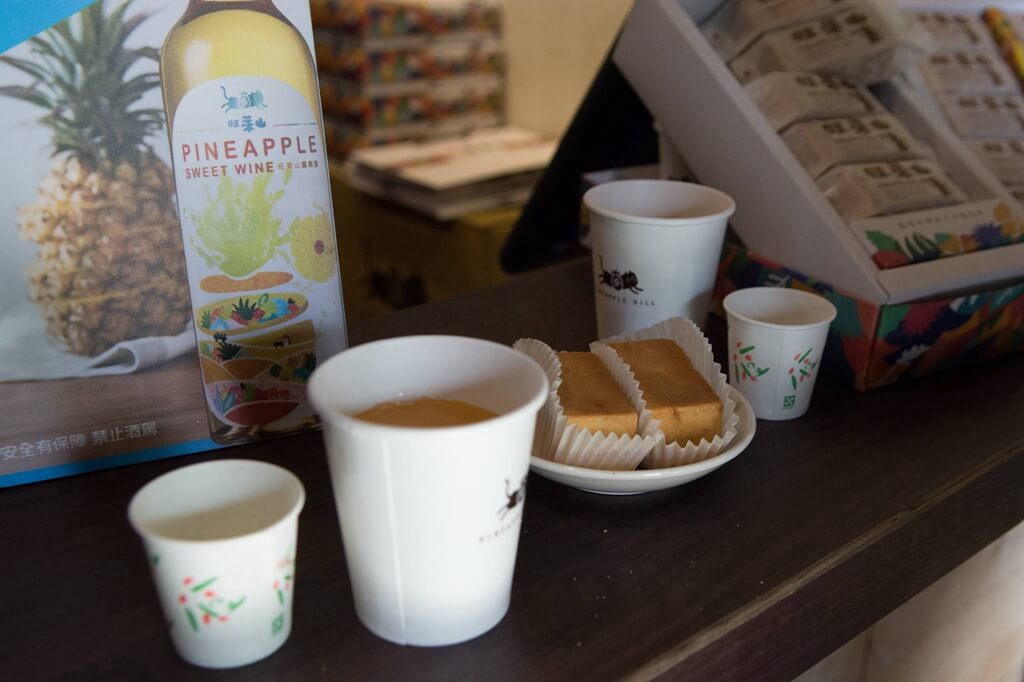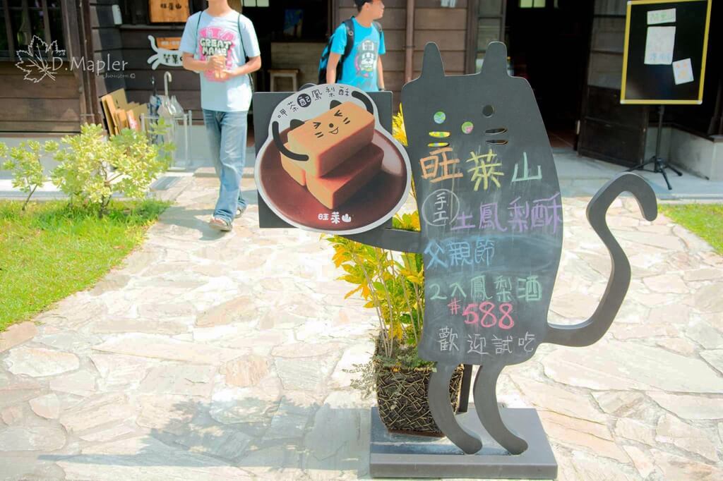 若是不想大老遠來到民雄,在嘉義市區也有個旺萊山喔,就坐落在檜意生活村裡面,在這邊一樣有提供鳳梨酥試吃,也有提供熱茶。