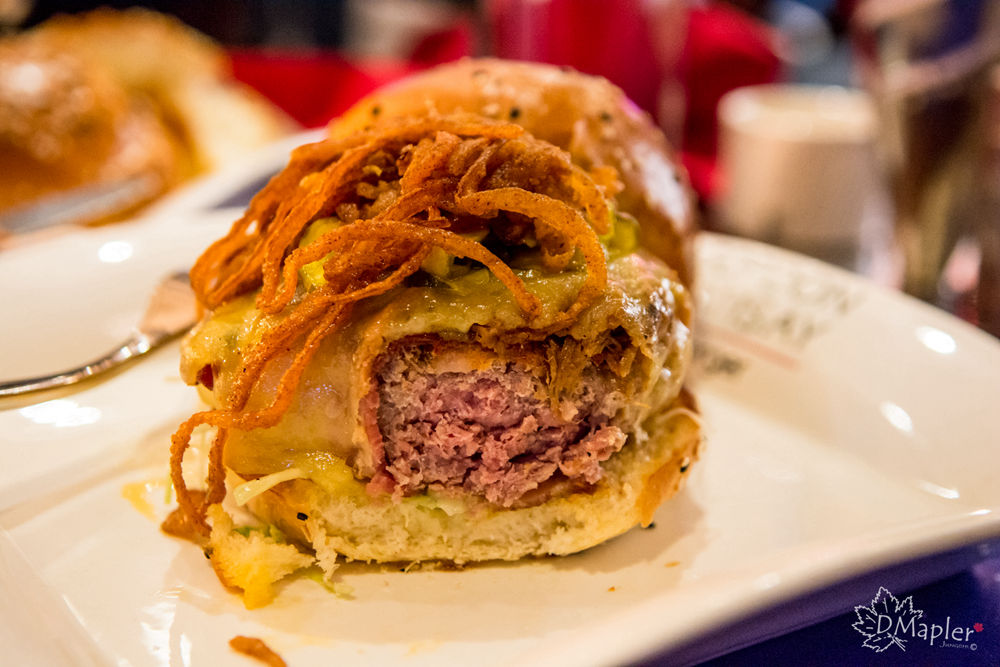 裡頭有切達乳酪小黃瓜與炸過的洋蔥,肉質飽滿豐厚,超級好吃,而且一個就可以吃超級飽的。