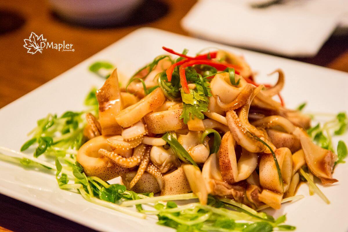 07|涼拌墨魚,彈脆墨魚汆燙切片,灑上香菜、蔥絲、辣椒絲,拌上特調微辣墨魚醬,噴香開胃。