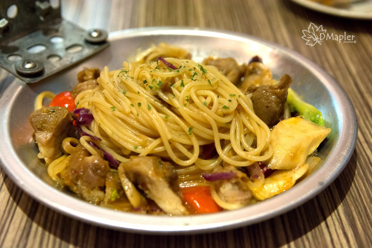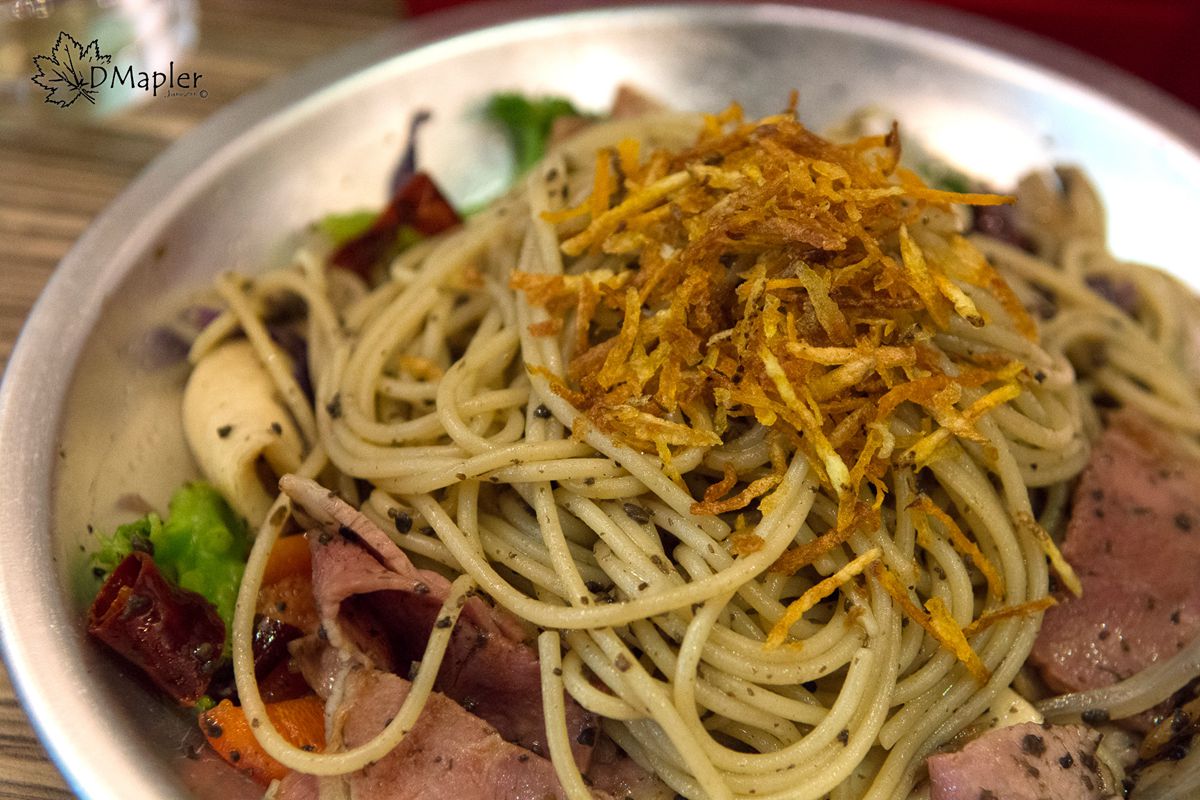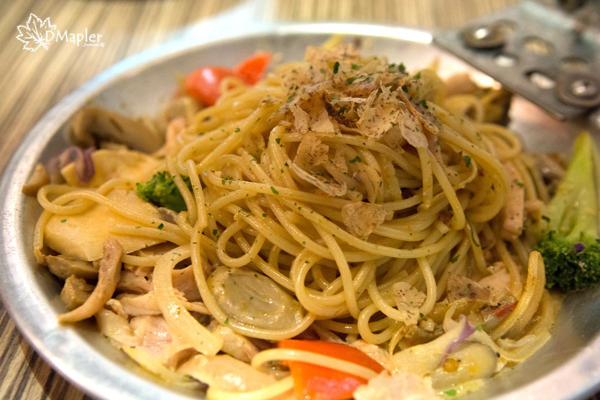 以台式經典的XO醬搭配義大利麵特製而成,上面灑了些許的芋頭片點綴,蠻有特色的創意料理,且口感蠻特別的,好吃。
