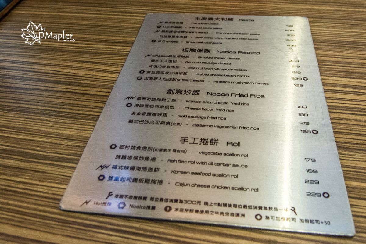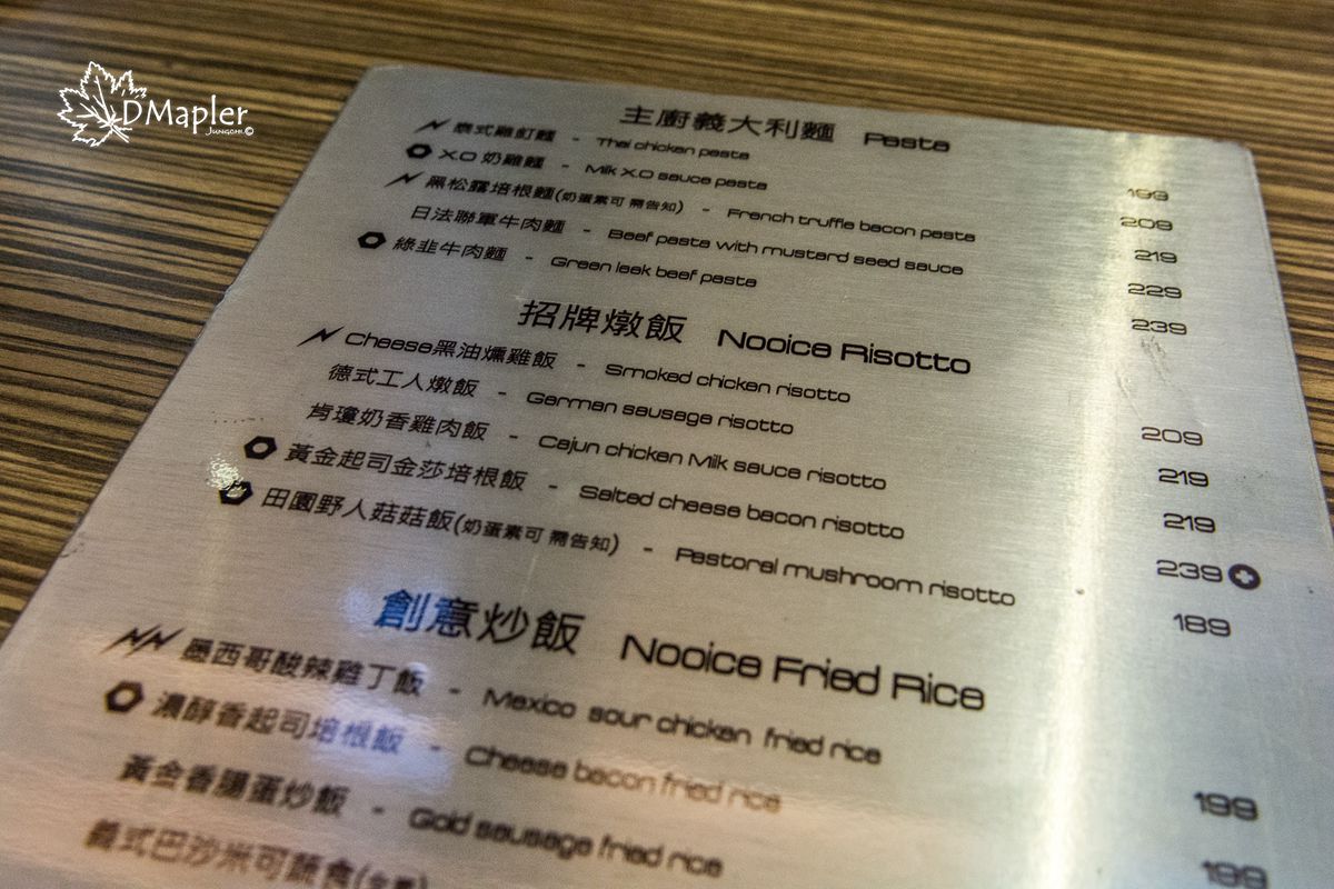 NOOICE店內菜單以銀色 (主食) 與金色 (飲品) 組成,上面有多樣的種類提供給客人選擇,主食有義大利麵、燉飯、炒飯、手工捲餅,因為每份餐點都是現點現做,需要稍微花點時間等待,大家也可以趁這段時間閒聊。