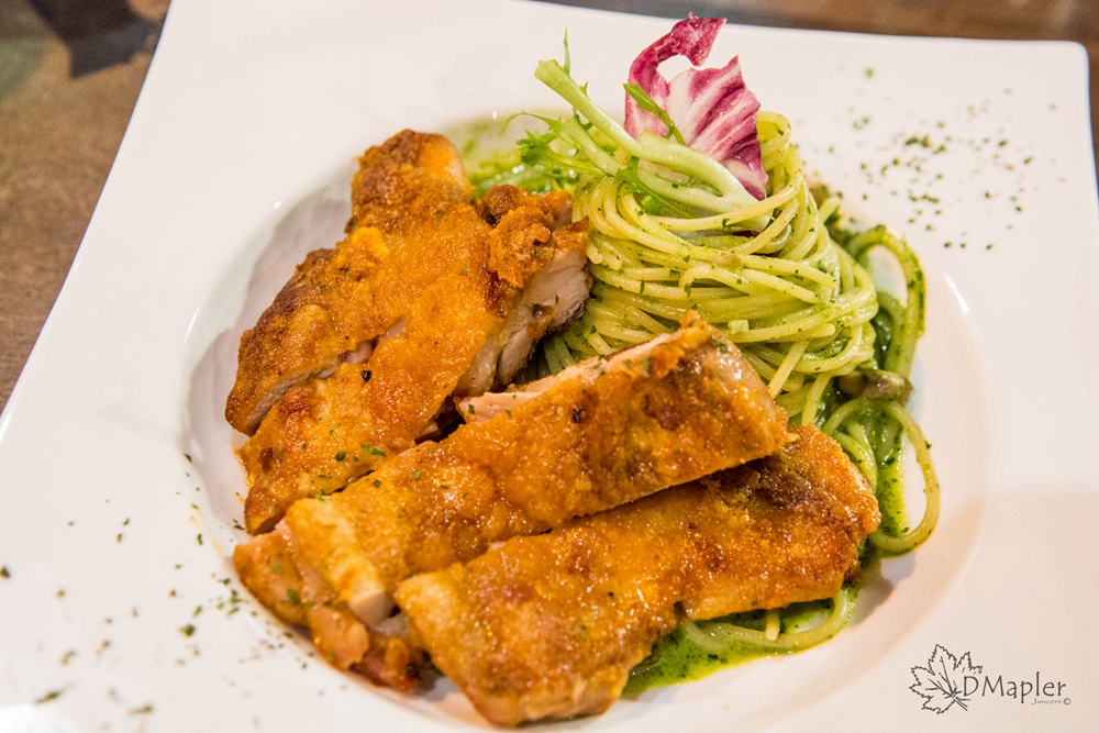 12|羅勒青醬口味的嫩煎雞腿排,麵條是一般的直麵。