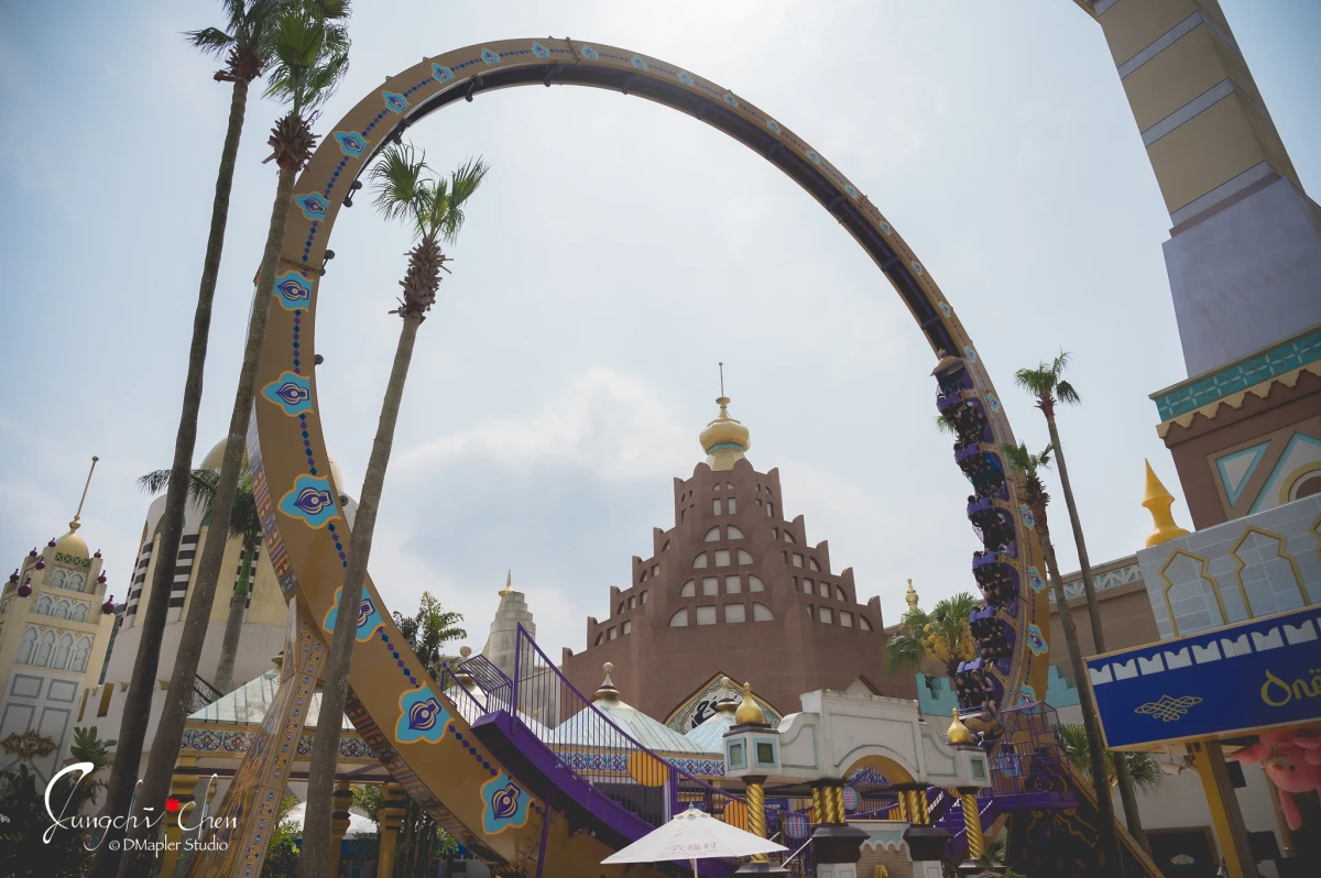 在阿拉伯皇宮區有「風火輪」、「阿里巴巴與四十大盜」、「阿努比斯的審判」、「天馬行空」、「哈比哈妮大冒險‧魔宮奪寶」還有停止使用很久的「蘇丹王大冒險 (永久停用)」 與 「飛毯」。在這區還有在魔幻劇場非常值得觀賞的的特定表演「皇宮奇緣」。